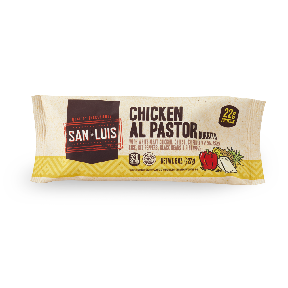 8.0 oz. | 10/cs. | San Luis Chicken Al Pastor Burrito is made with white meat chicken, cheese, chipotle salsa, rice, red peppers, black beans, and pineapple in a warm flour tortilla; just heat and eat!