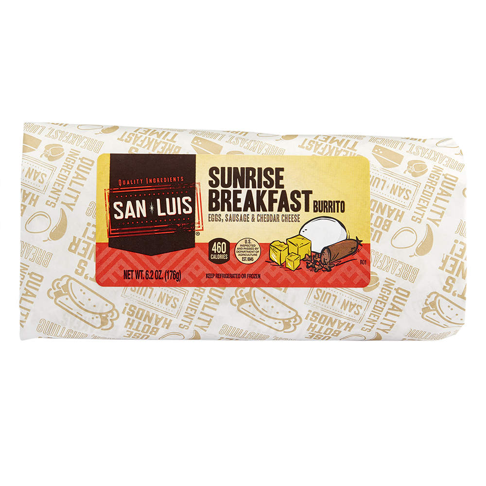 6.2 oz. | 12/cs. | San Luis Sunrise Breakfast Burrito is made with scrambled eggs, sausage, and cheddar cheese with green peppers and potato shreds in a warm flour tortilla; just heat and eat!