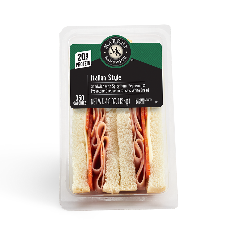 6 oz. | 6/cs. | Market Sandwich Italian Style Sub is made with spicy ham and pepperoni combined with premium provolone and Romano cheese, then all nestled in a soft French roll.