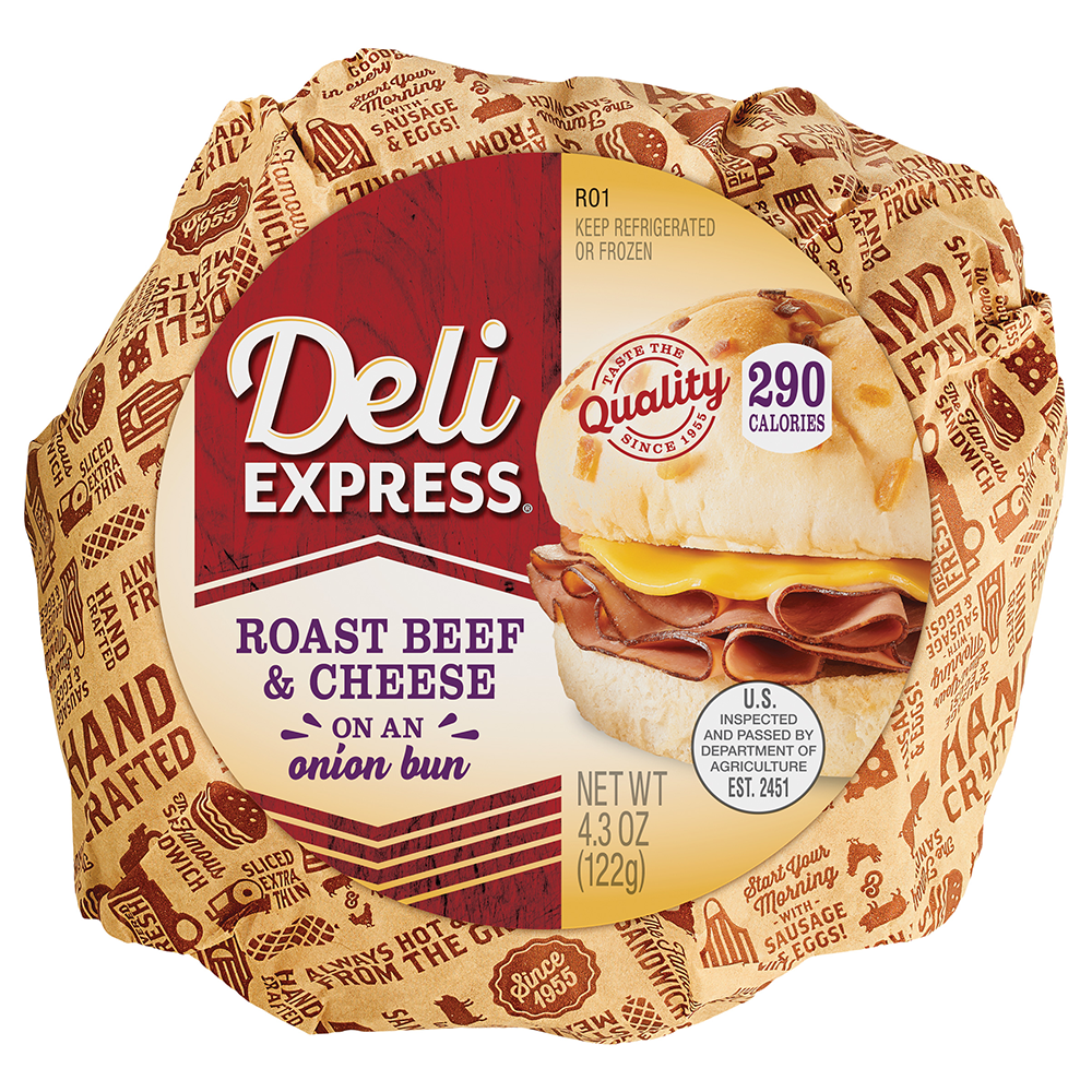 4.3 oz. | 10/cs. | Deli Express Roast Beef & Cheese is made with tender roast beef and melted cheese on an onion bun; just heat and eat!